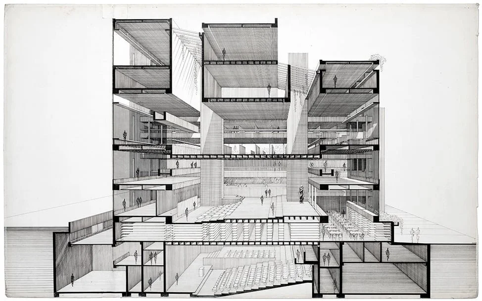 Left: Yale University Art and Architecture Building: Section Perspective. [Via the Paul Rudolph Foundation]